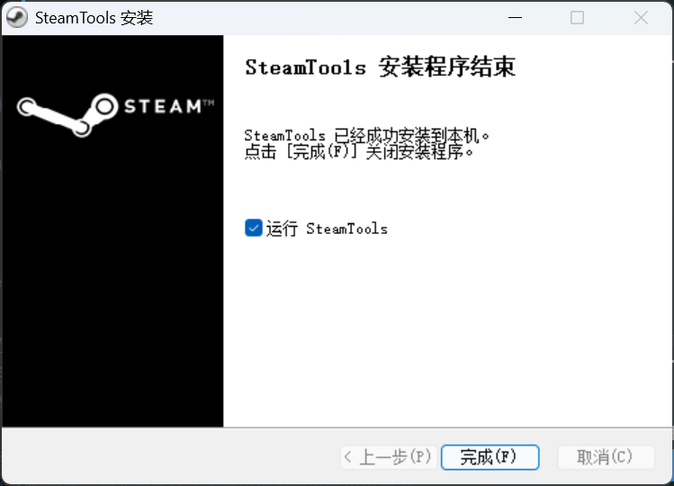 - 勾选「运行SteamTools」选项,然后点击「完成」按钮