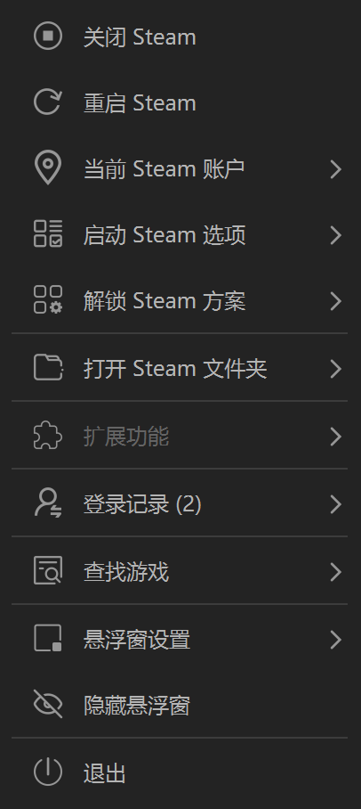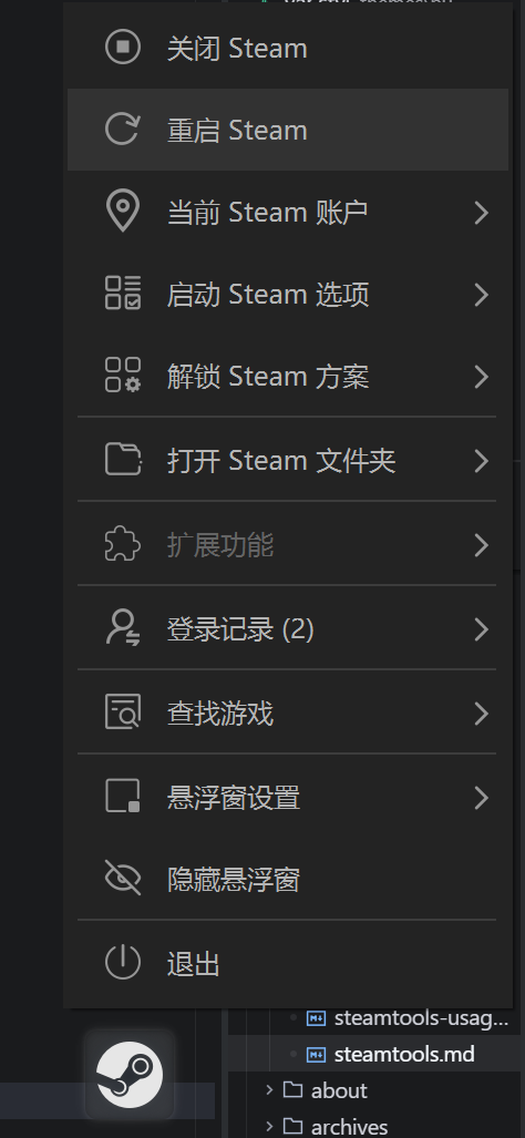 右键点击悬浮窗可以进行各种操作,本文中我们主要会用到「重启Steam」功能